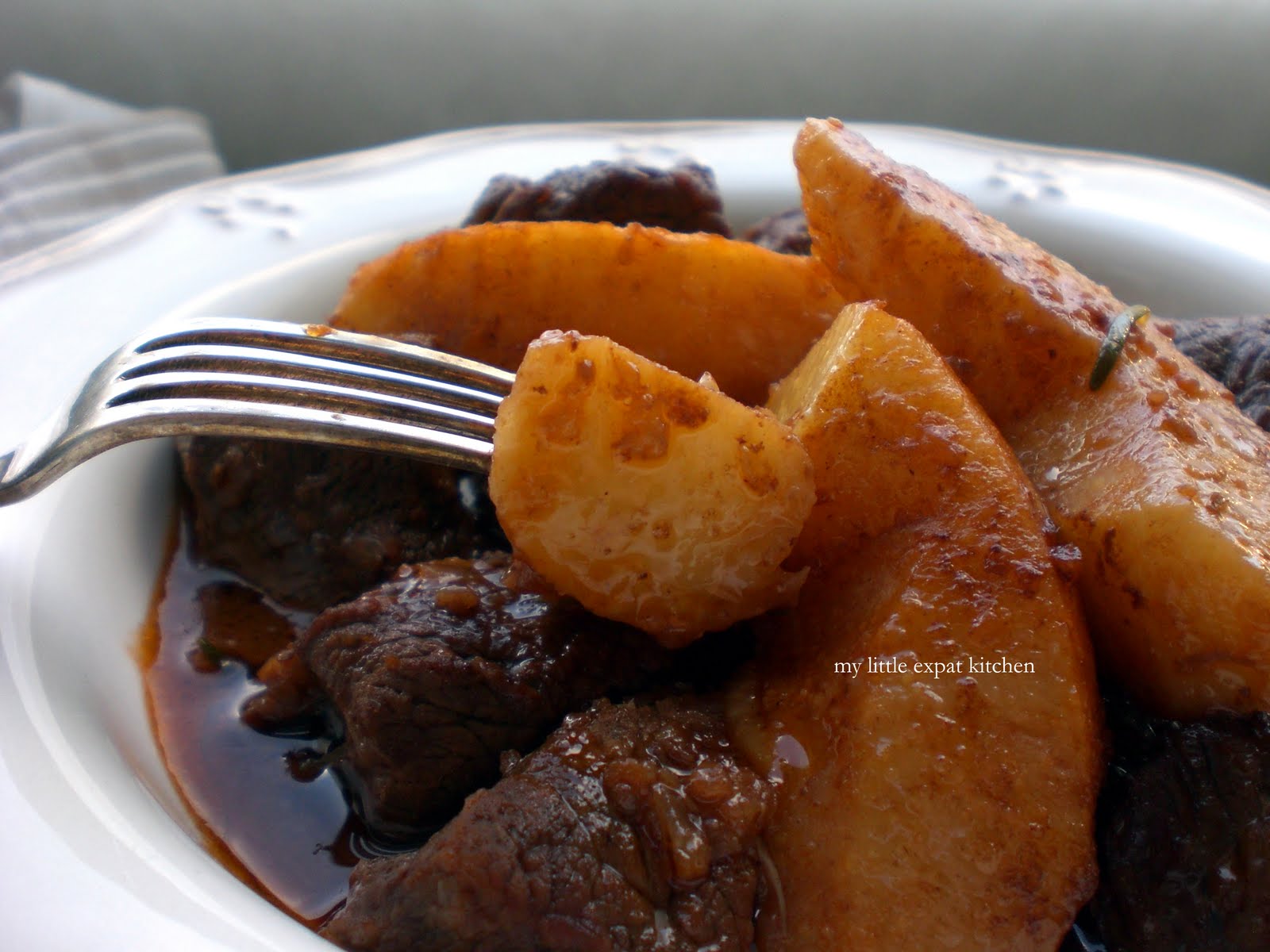 The beauty of this dish is in its sweet and sour flavors and contrasting textures of tender, succulent beef in a rich sauce and juicy, soft yet firm quinces.